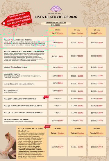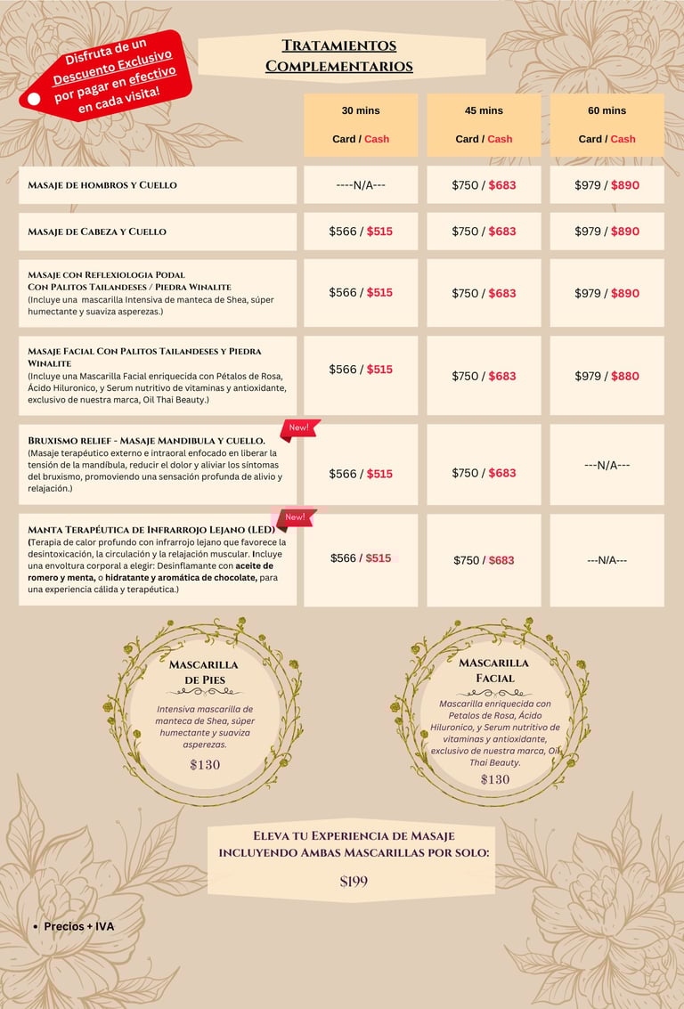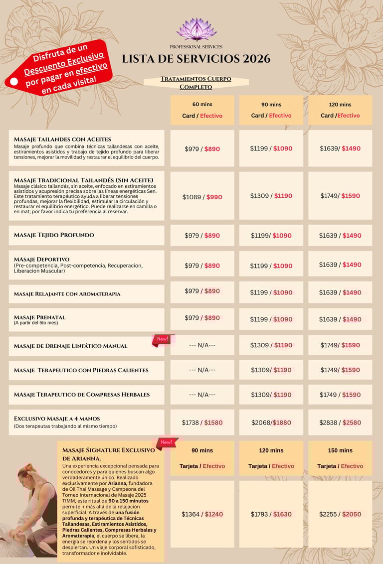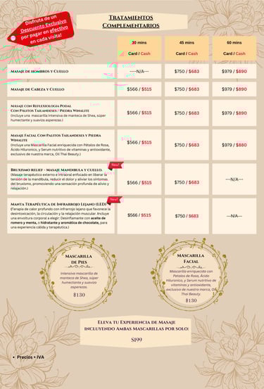 Escape the rush of Mexico City and unwind in our peaceful oasis. We specialize in personalized Traditional and Oil Thai Massage, plus signature therapies like 4-Hand Massage, Hot Stones, and Hot Compresses for deep relaxation and stress relief.