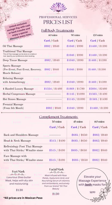 Opt for a 90-minute or 120-minute session to indulge in a deeper, more focused massage experience. These extended treatments are perfect for those well-acquainted with Thai massage or anyone seeking to immerse themselves in a comprehensive and revitalizing escape. With extra time, our skilled therapists can address tension more thoroughly, ensuring you leave feeling invigorated and completely at ease.